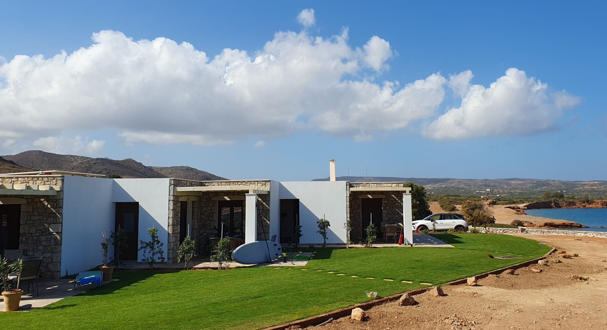 Hinweis auf nicht gepflasterte Zufahrtstrasse: Die Zufahrt zu unseren Kavo Plako Studios ist ein befestigter, aber nicht geteerter Strandweg. Zur Vermeidung von Beschädigungen an Ihrem Fahrzeug sollten Sie darauf achten, dass es über genügend Bodenfreiheit verfügt. Wir empfehlen mindestens 18 cm (etwa Suzuki Ignis 2020, oder Seat Arona , Dacia Spring…)